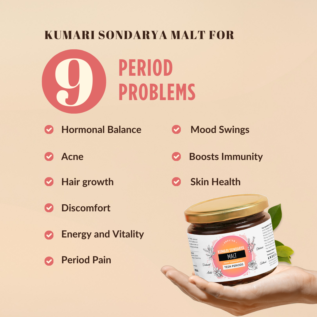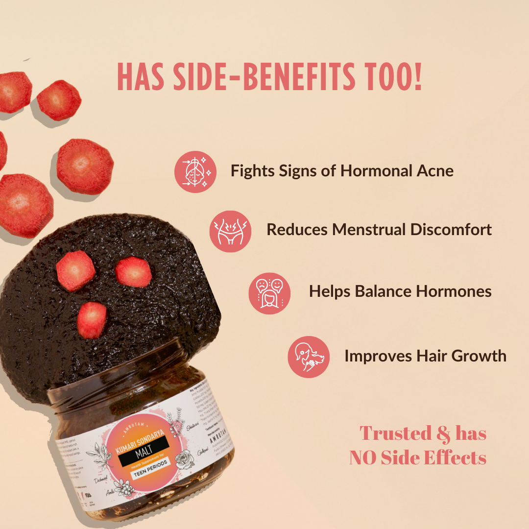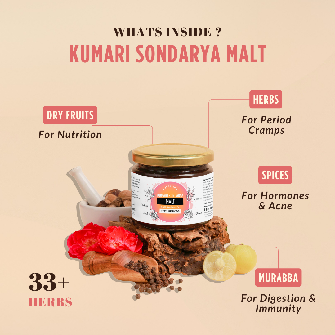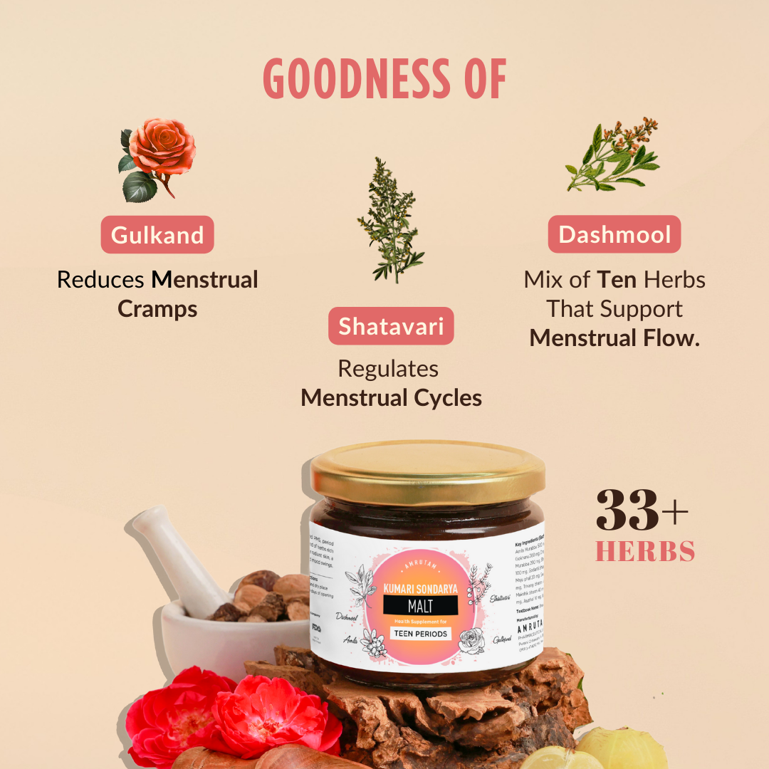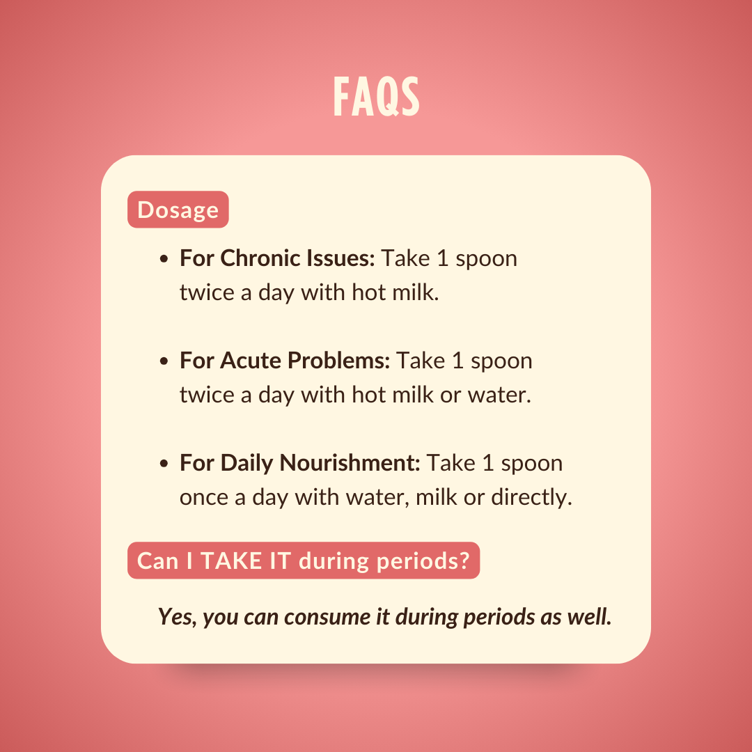 Ashok (Saraca asoca, St. Bk.) 500 mg, Lodhra (Symplocos racimosa, St.Bk.) 800 mg, Shatawari (Asparagus racemosus, Rt.) 500 mg, Mulethi (Glycyrrhiza glabra, Rt., St.) 100 mg, Rakt Chandan (Pterocarpus santalinus, Wd.) 100 mg, Shankhpushpi (Convolvulus pluricaulis, Pl.) 100 mg, Nagar motha (Cyperus rotundus, Rz.) 50 mg, Sariba (Hemidesmus indicus, Rt.) 50 mg, Daru haldi (Berberis aristata, Rt., St.) 50 mg, Mandukparni (Centella asiatica, W.pl.) 50 mg, Ghritkumari (Aloe barbadensis, Lf.) 50 mg, Moringa (Moringa pterygosperma, Bk., Gm.) 50 mg, Gond Katira (Astragalus gummifer, Fr.) 30 mg, Lavang (Eugenia aromatica, Fl. Bud) 30 mg, Safed jeera (Cuminum cyminum, Sd.) 30 mg, Chaturjat 30 mg, Chikani supari (Areca catechu, Fr.) 30 mg, Maju phal (Quercus infectoria, Fr.) 30 mg, Vanslochan (Bambusa arundinacea) 20