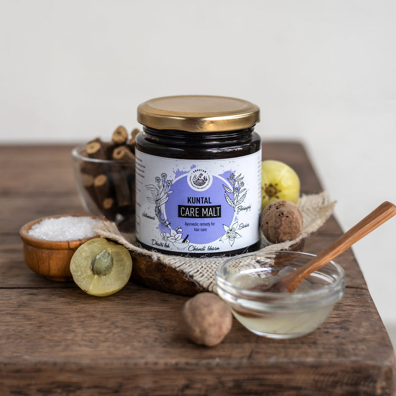 Amla murabba (Emblica officinalis, Fr.) 4000 mg, Harad murabba (Terminalia chebula, Fr.) 500 mg, Gulkand (Rosa centifolia, Fl. petal) 500 mg, Bhringraj (Eclipta alba, W.p.l.) 500 mg, Brahmi (Bacopa monnieri, W.p.l.) 250 mg, Amrit bel (Tinospora cordifolia, St.) 250 mg, Ashwagandha (Withania somnifera, Rt.) 100 mg, Baheda (Terminalia bellirica, Fr.) 200 mg, Mulethi (Glycyrrhiza glabra, Rt.) 50 mg, Badam giri (Prunus amygdalus, Sd.) 50 mg, Aloe vera (Aloe vera, Lf.) 50 mg, Sariva (Hemidesmus indicus, Rt.) 50 mg, Khadira (Acacia catechu, Bk.) 50 mg, Kusha (Eragrostis cynosuroides, Sd.) 25 mg, Jatamansi (Nardostachys jatamansi, Rz.) 25 mg, Chirongi (Buchanania lanzan, Sd.) 25 mg, Ashtangavaleh 1000 mg, Drakshavaleh 500 mg, Smrati sagar ras 50 mg, Tarkeshwar ras 50 mg, Swarn makshik bhasma 50 mg, Chandi bhasma 2 mg, Sugar and malt base Q.S.