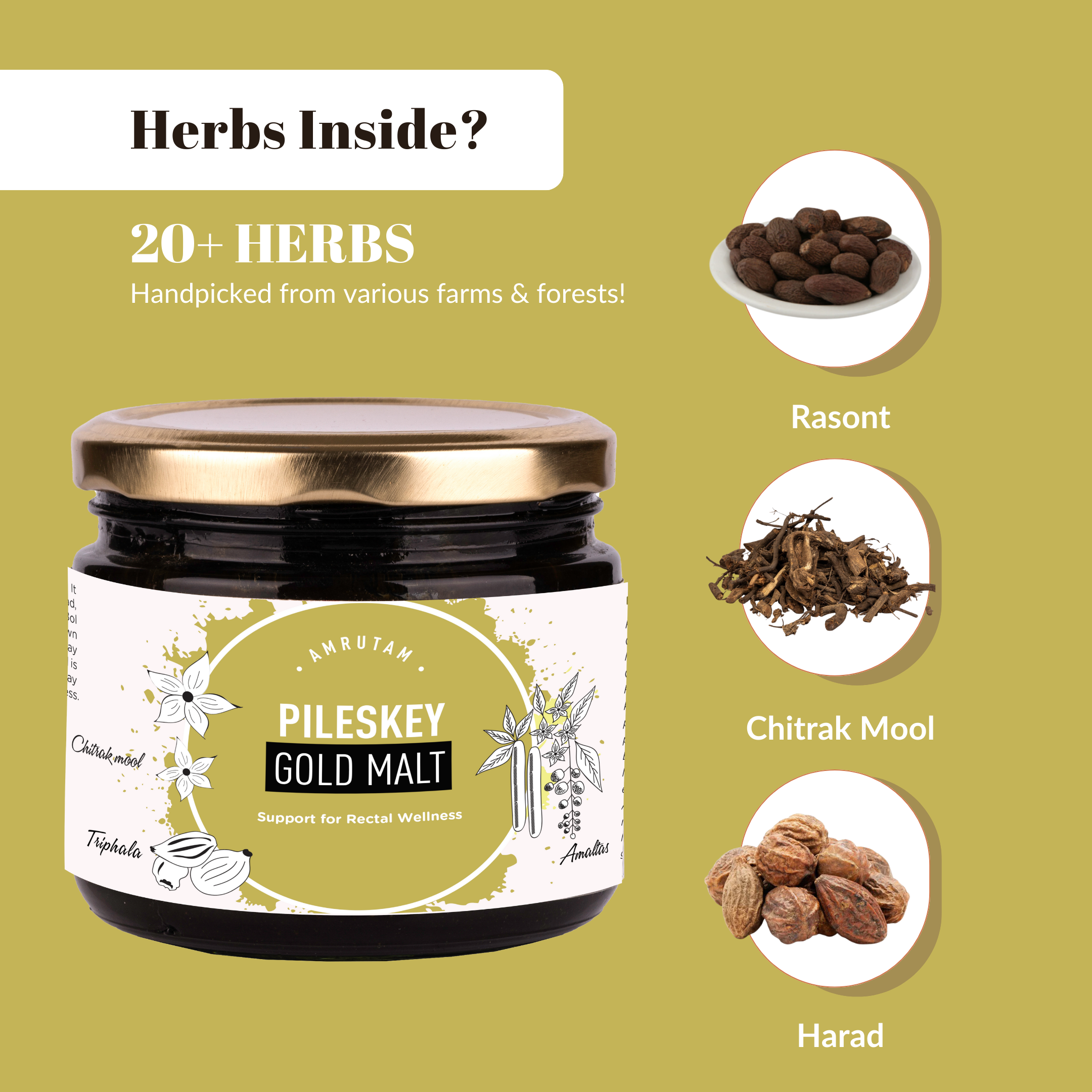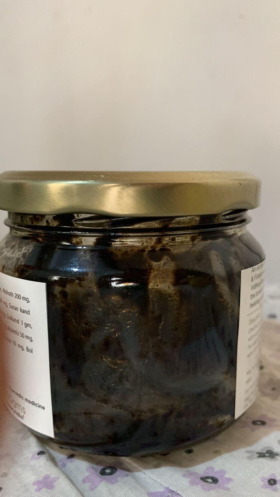 Rasont (Extractum berberis, Ext.) 100 mg, Shuddha Guggle (Ext.) 200 mg, Harad Murabba (Terminalia chebula, Fr.) 2 gm, Nishoth (Operculina turpethum, Rt.) 200 mg, Chitrak mool (Plumbago zeylanica, Rt.) 300 mg, Kalihari (Gloriosa superba, Rz.) 2 mg, Dantimool (Baliospermum montanum, Rt.) 2 mg, Karanj (Pongamia glabra, Lf.) 200 mg, Suran kand (Amorphophallus campanulatus, Rz.) 200 mg, Amaltas (Cassia fistula, Fr. pulp) 100 mg, Kaharava pisthi 50 mg, Triphala (Combination of ETT, Fr.) 900 mg, Gulkand (Rosa centifolia, Fl. petal) 1 gm, Munakka (Vitis vinifera, Fr.) 200 mg, Revand chini (Rheum emodi, Rt.) 100 mg, Indrayan (Citrullus colocynthis, Rt.) 50 mg, Alua (Aloe vera, Fr.) 20 mg, Mulethi (Glycyrrhiza glabra, Rt.) 50 mg, Yogendra ras (Swarn yukta) 10 mg, Yashad bhasma 40 mg, Nag bhasma 10 mg, Bol parpati 40 mg, Anardana (Punica granatum, Fr.) 200 mg, Trikatu 300 mg, with Sita Q.S.